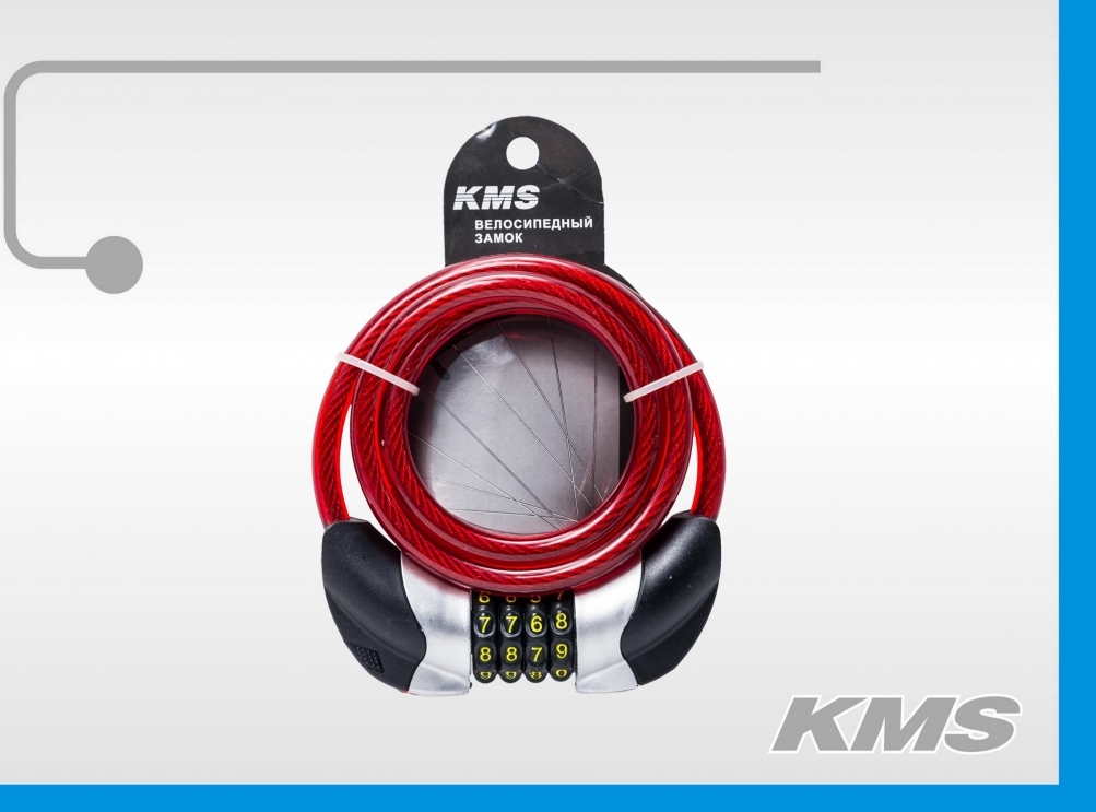 Велозамок "KMS", трос Ø 10*1500, сменный код с подсветкой, 4 цвета , индивидуальная упаковка